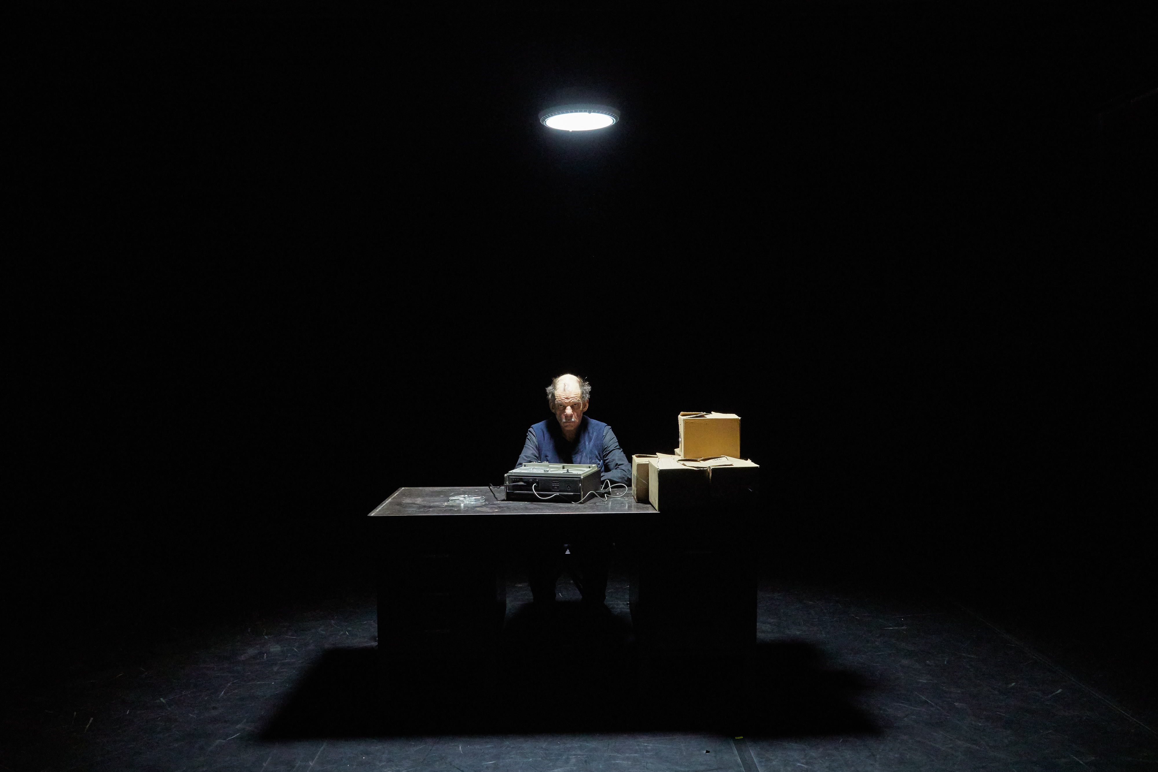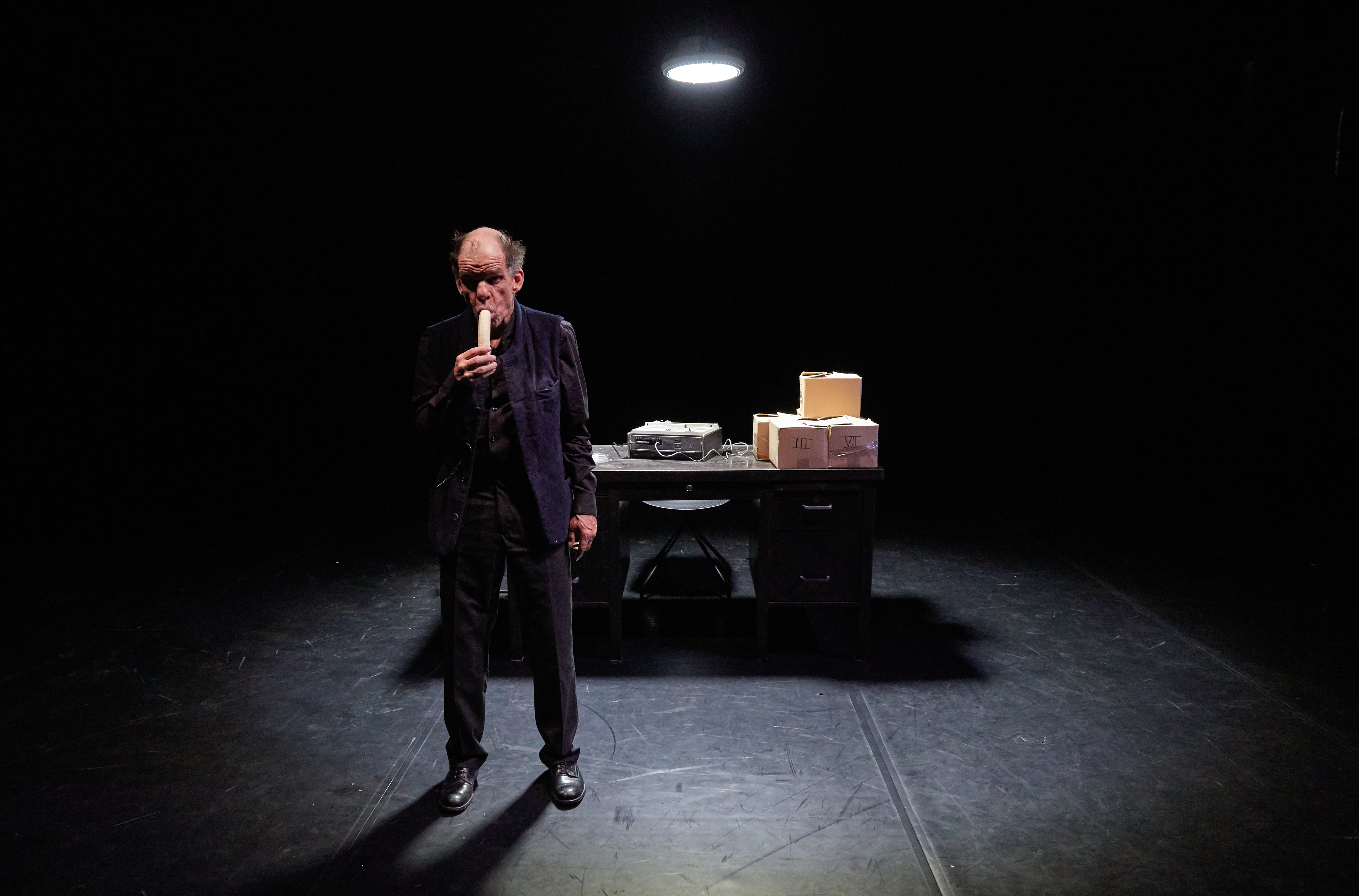 Le travail le plus important a été d’enregistrer la bande, de rendre crédible l’enregistrement d’un type de 39 ans, de trouver une énergie, un rythme, une sorte d’aplomb, de prétention même qui est autre que celle qu’il a à 69 ans. Ensuite pour moi c’est de rentrer dans un rythme décrit par Beckett : je me mets avant tout au service de la partition. Beckett dit que Krapp voit mal, qu’il entend mal et qu’il a une démarche laborieuse. Donc je me suis appliqué à faire cela. Un truc absolument concret — ça peut paraître idiot mais c’est comme ça que je travaille — j’ai trouvé des chaussures dans une brocante à Paris, des vieilles chaussures de l’armée américaine, et je me suis dit “Ah voilà, c’est exactement ça qu’il me faut !”. C’est à la fois de belles chaussures et des chaussures qui sont bien, qui sont raides, où l’on est un peu engoncés et qui m’aident à avoir cette démarche qui est un peu chaplinesque aussi…mais un peu de vieux, un peu laborieuse comme c’est décrit.
