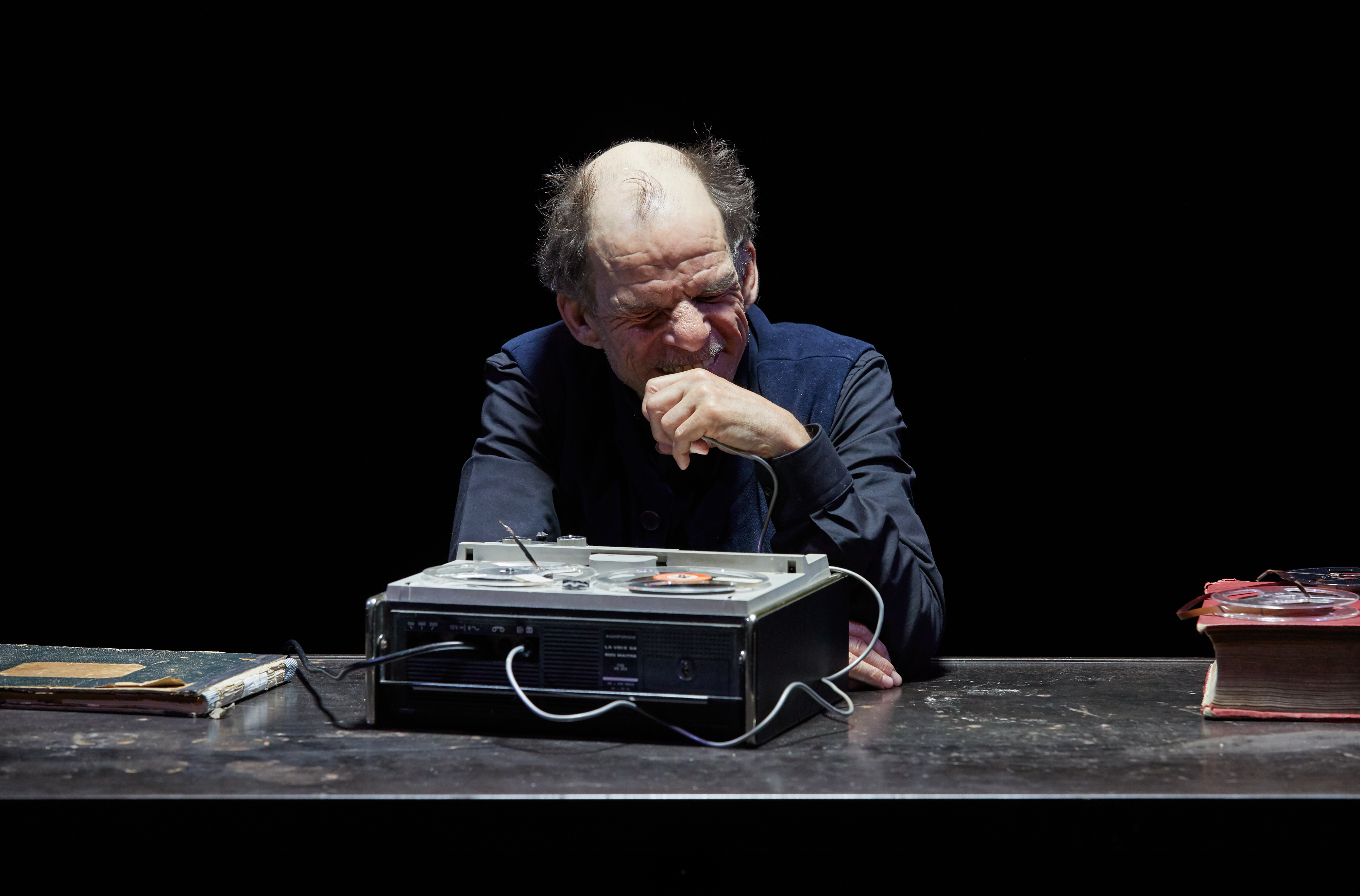 Il y a une partition ! En général dans ce cas-là je me déplace vers le personnage. Ce que donne Beckett dans la bande enregistrée et dans la bande qu’il enregistre ce sont des éléments de la vie de ce personnage, de son état de solitude. On trouve un personnage qui fête son anniversaire avec un rituel. Depuis des années il écoute une vieille bande qu’il a enregistrée et il en enregistre une. Là il a 69 ans et il écoute une bande enregistrée trente ans auparavant où il parle d’une bande qu’il a lui-même enregistrée douze ans auparavant donc quarante-deux ans avant ses 69 ans. Ca fait part de trois moments de sa vie et ça raconte quelque chose d’une grande période de vie d’un personnage qui avance…et en même temps ce qui est intéressant avec la bande enregistrée c’est que c’est un écho d’un présent d’une autre époque. Il est toujours dans une attitude plus critique en étant plus âgé par rapport à ce qu’il a enregistré les années d’avant. Donc c’est particulier.